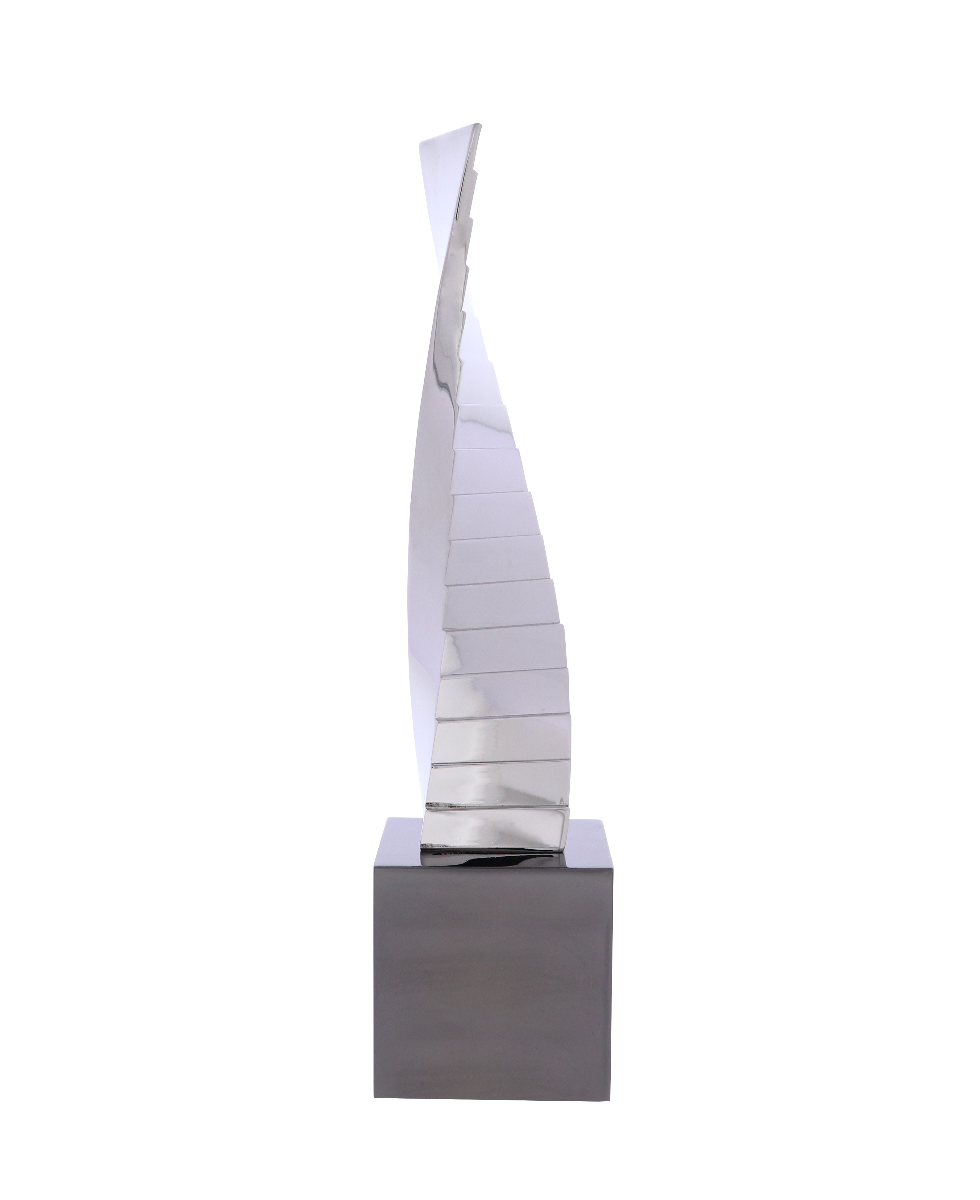 Our Ascent Silver is a magnificent tower that possesses a twisting formation. One side of the twist is sleek and smooth, while the other is made up of cascading panels. Created from zinc and plated in pure silver, this piece rotates off a cube-shaped base of black aluminum.