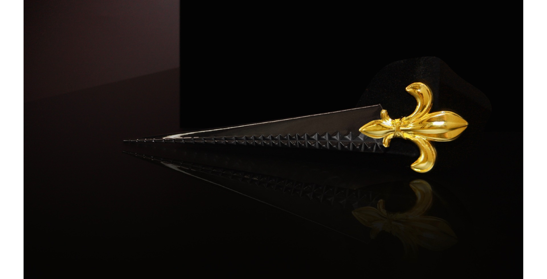 This striking office accessory was crafted to make a statement. The elegant fleur de lis handle is contrasted with an edge studded "blade."