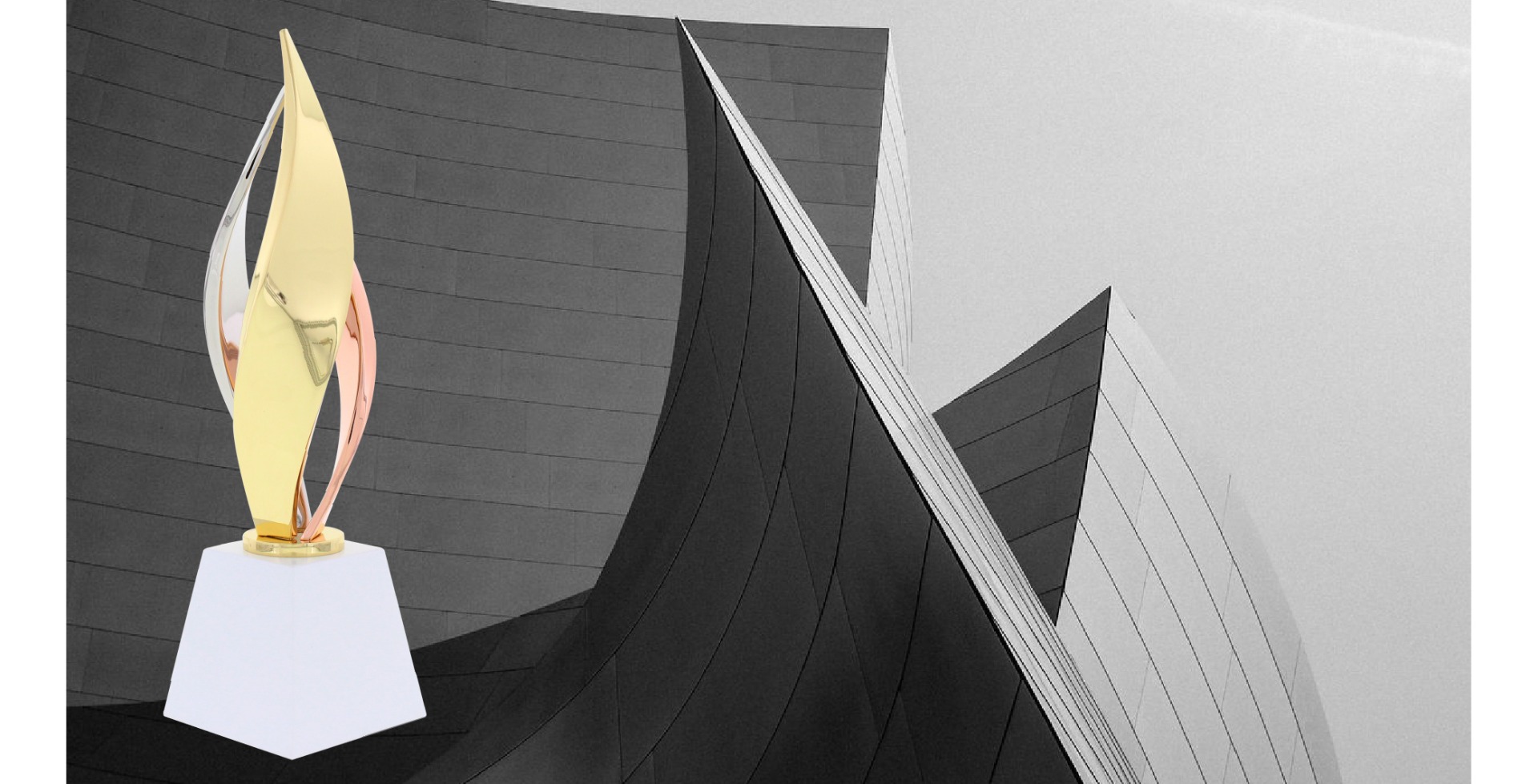 This energetic sculpture embodies a big accomplishment and bright future with its upward visual movement. Lively curving panels in silver, gold and bronze twist upward out of a tapered white painted metal base. Honor your brightest winners and honorees with an award that will impress. This trophy is a versatile recognition piece as suited for top sales honors as for creative or technical achievement. The gleaming, polished form arrives in our gold packaging for an impressive presentation.