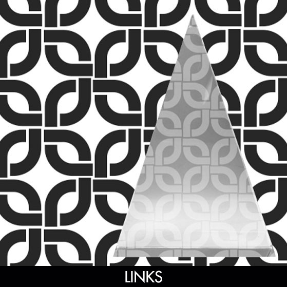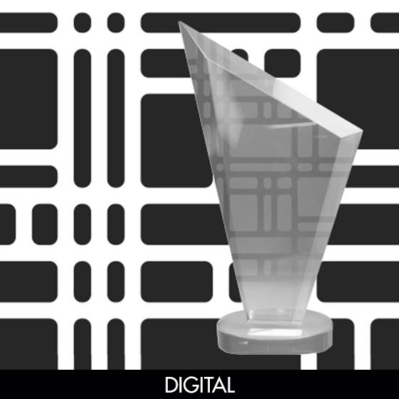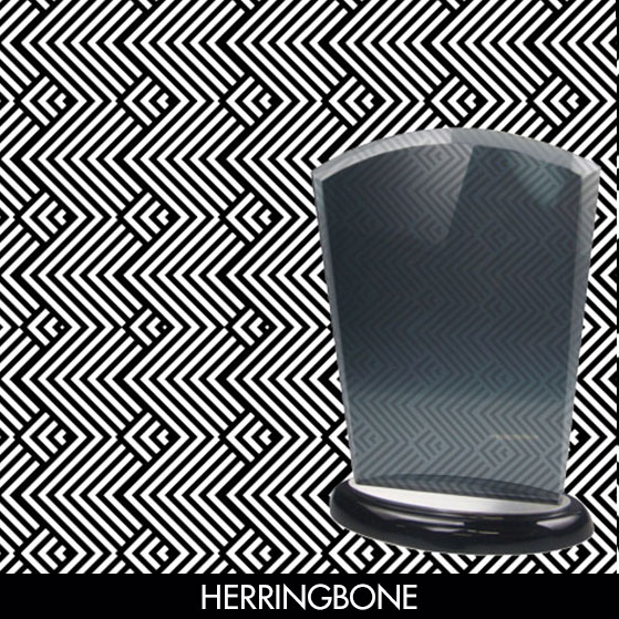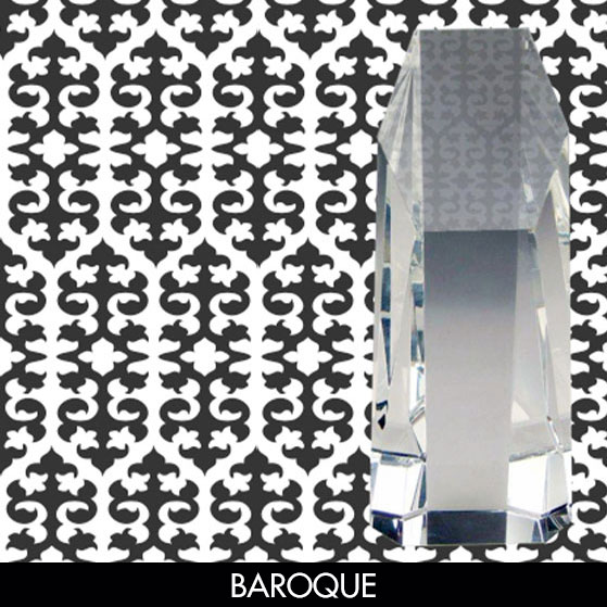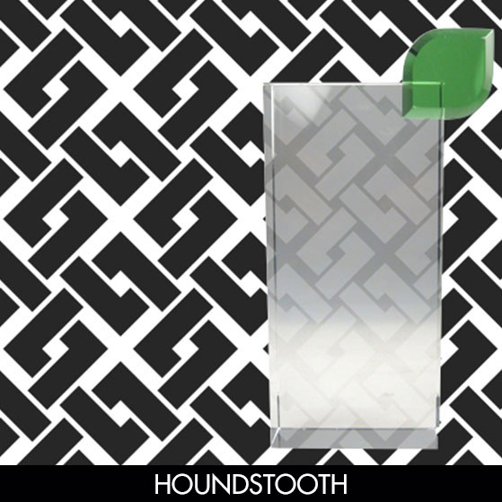 Additionally, many products can be enhanced by etching or printing one of our exclusively designed patterns onto the face of the award, transforming a stock product into something truly unique and special. This pattern customization option is available on most flat or semi-flat crystal, acrylic, and glass awards. The cost of this feature is $5.00 per unit, plus a setup charge of $50 per award type. Clients should contact Society Awards directly to incorporate these exclusively designed patterns.