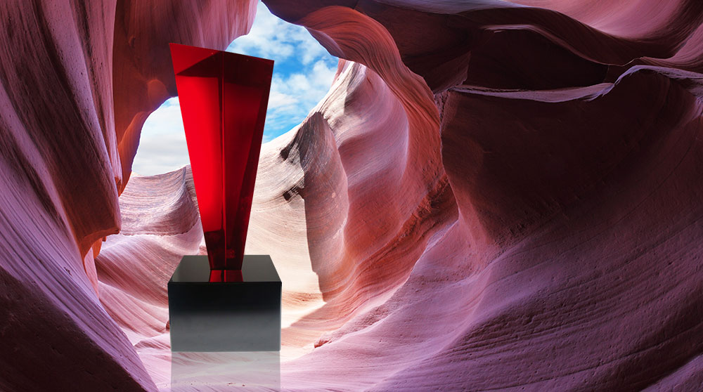 Dramatically large and brilliant custom red tinted prism of acrylic rises from a black, beveled acrylic base. This award is translucent, light plays around and through the award for a beautiful, colorful effect. These sculptures are individually made to order and require a two week lead time.