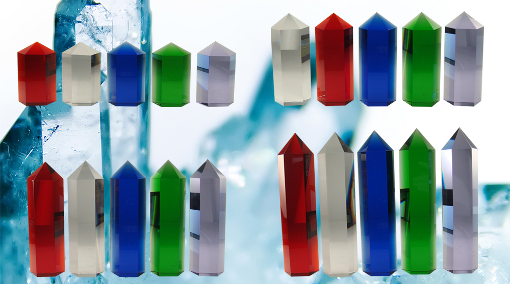 These stunning monoliths are made to be versatile. The shape is of a hexagonal bar of solid crystal, cut in half to create a wider flat side, and the lines drawn together to form a pointed top. They can be positioned independently with the edged side facing out, or with the flat side out to provide more area for etching or visual depth. They can be combined with a stock base in different sizes and colors to create unique but coordinating pieces. The series was created to provide beautiful, original flexibility and versatility in crystal sculptures. Available in four sizes each of clear, black, blue, green, red and purple crystal. Base sold separately.