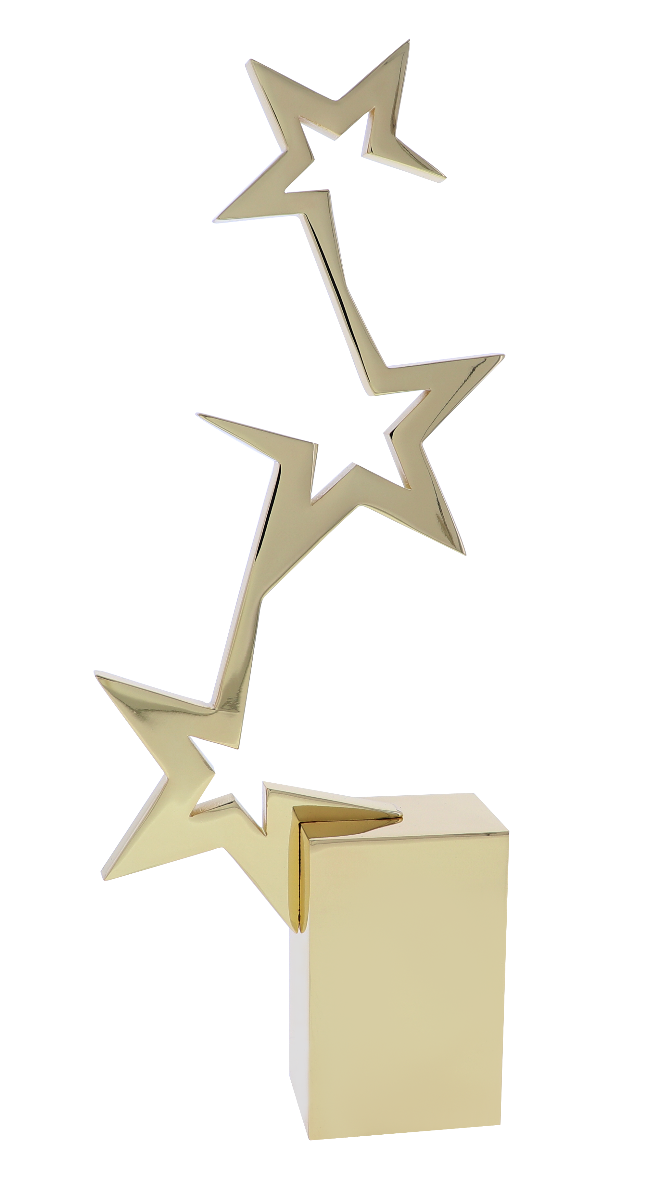 The Star 4 is a creative trophy that alludes to an ascent to the heavens. Each star, created by the negative space of the art, is outlined in an electroplated gold for a brilliant finish. Star 4 can be further customized to recognize significant individual contributors.