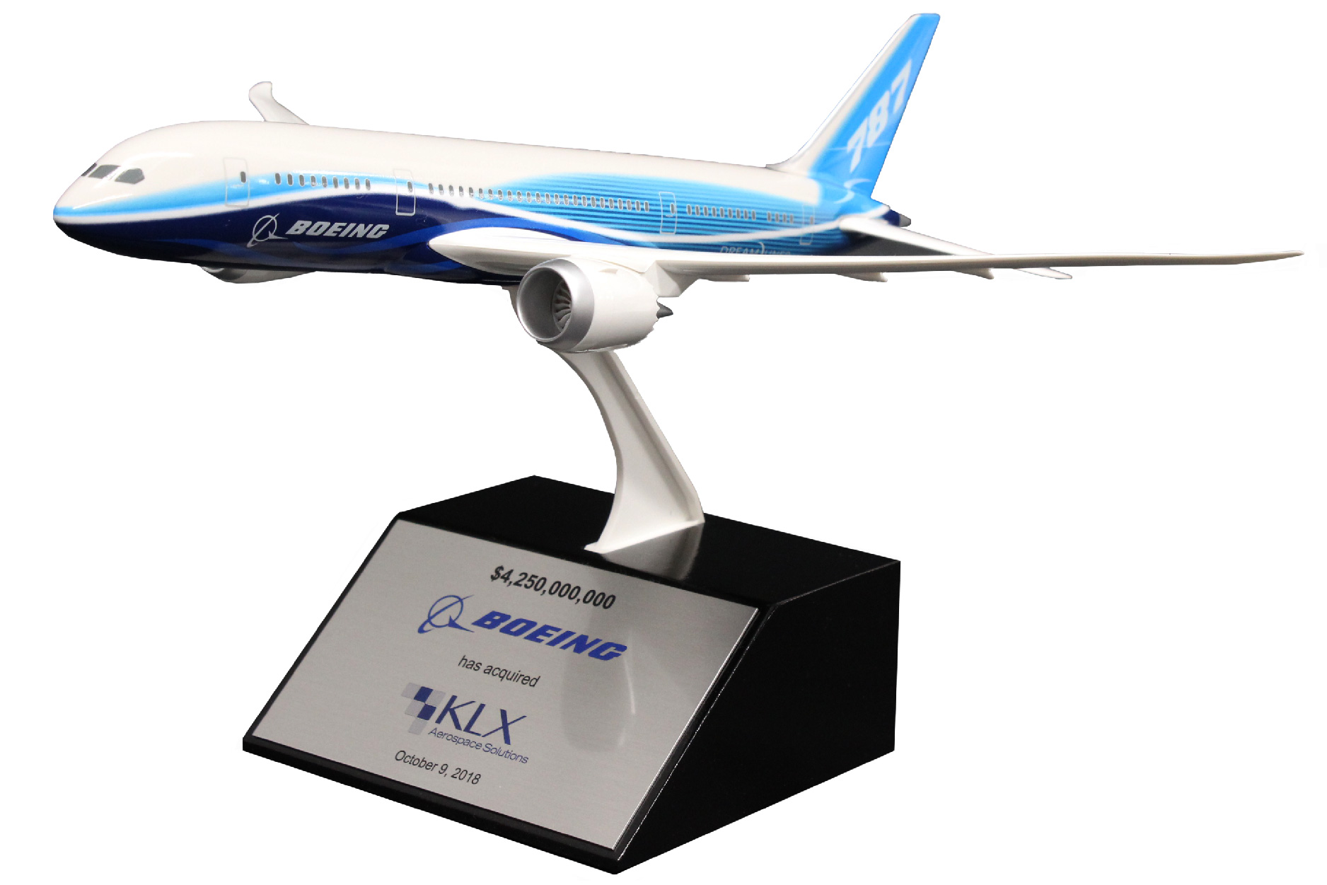 Model plane with custom branding is mounted on a tapered base.