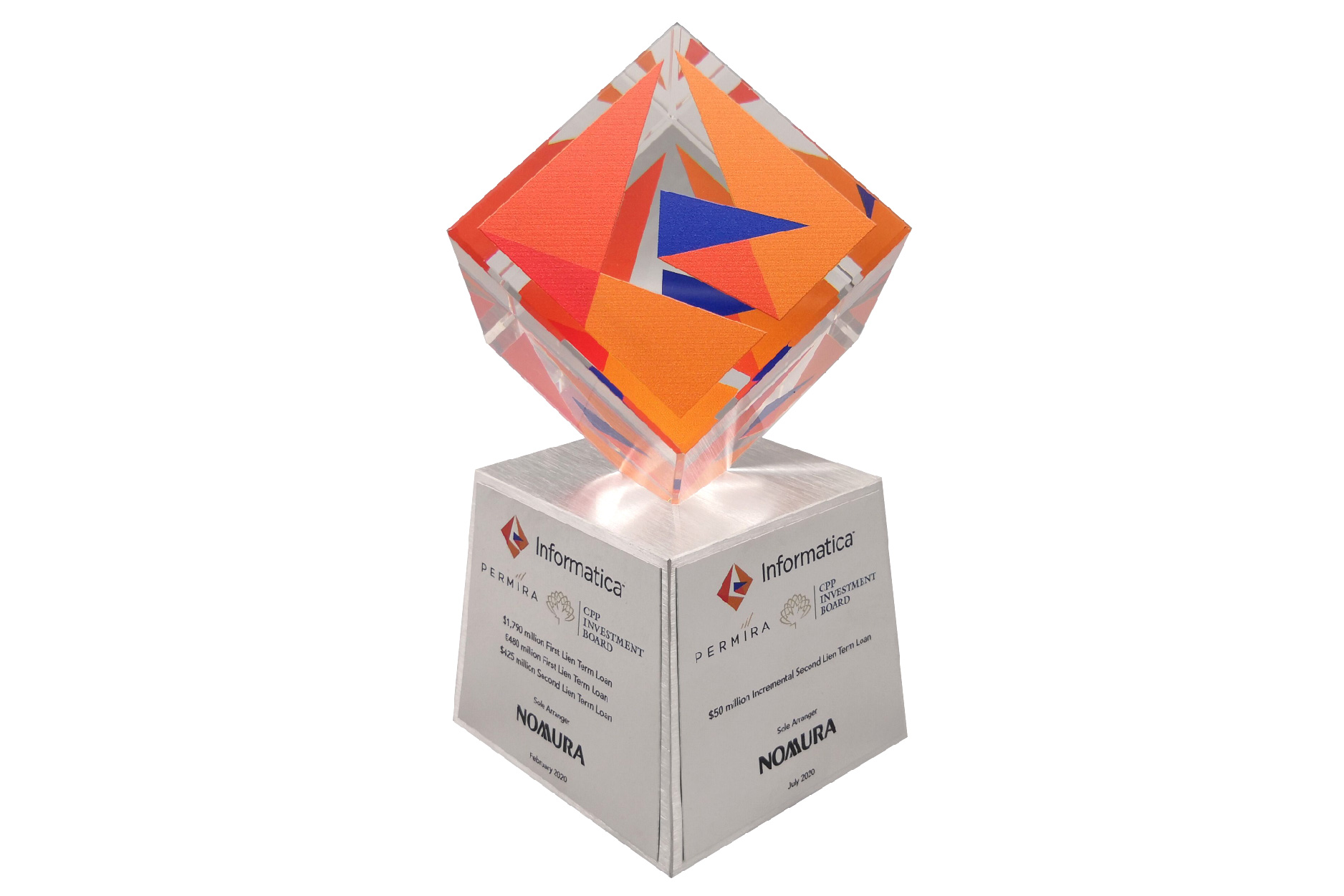Custom color printed crystal cube mounted on tapered base with details of a financial transaction.