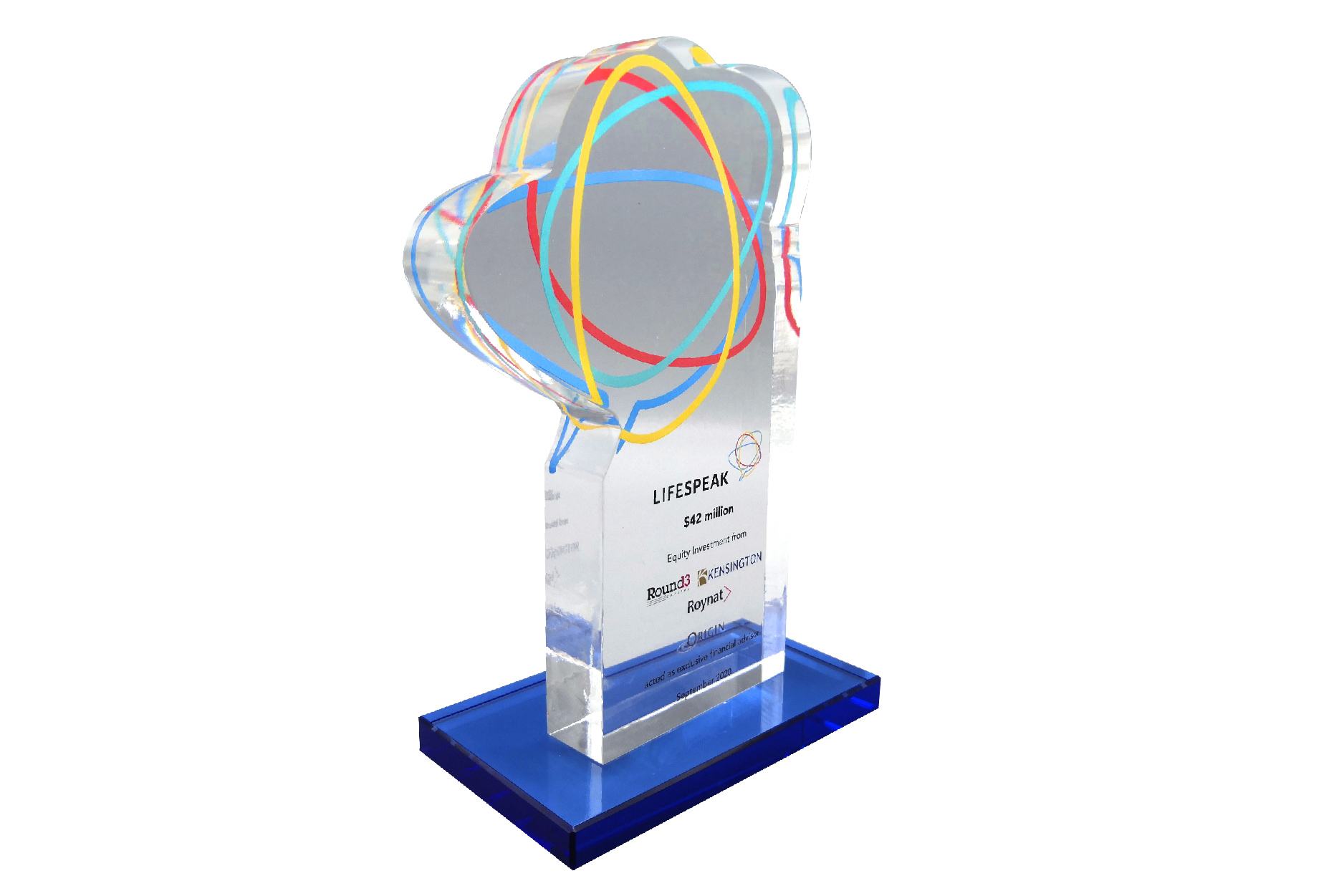 A luxury deal gift crafted for an equity investment transaction. The central plaque is a custom-cut logo with color printing and is mounted on an elegant blue base.
