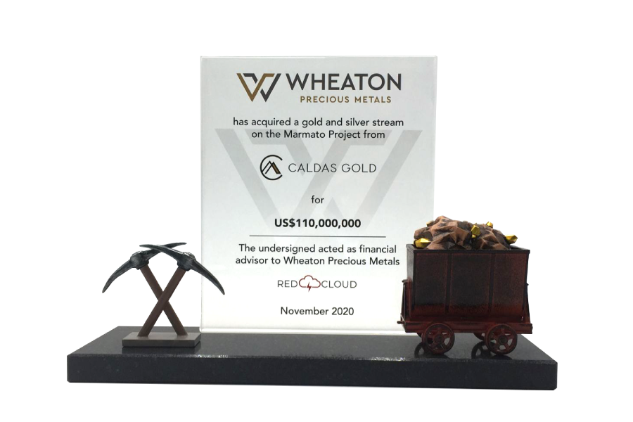 This unique custom financial tombstone includes a reverse-etched plaque with financial transaction details and model pick-axe and mining cart.