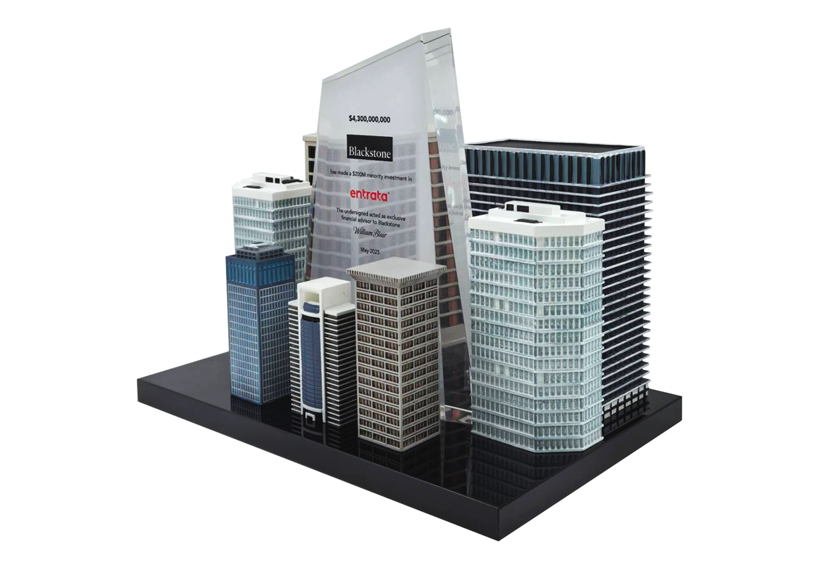Modern resin and crystal financial tombstone featuring a city in 3D