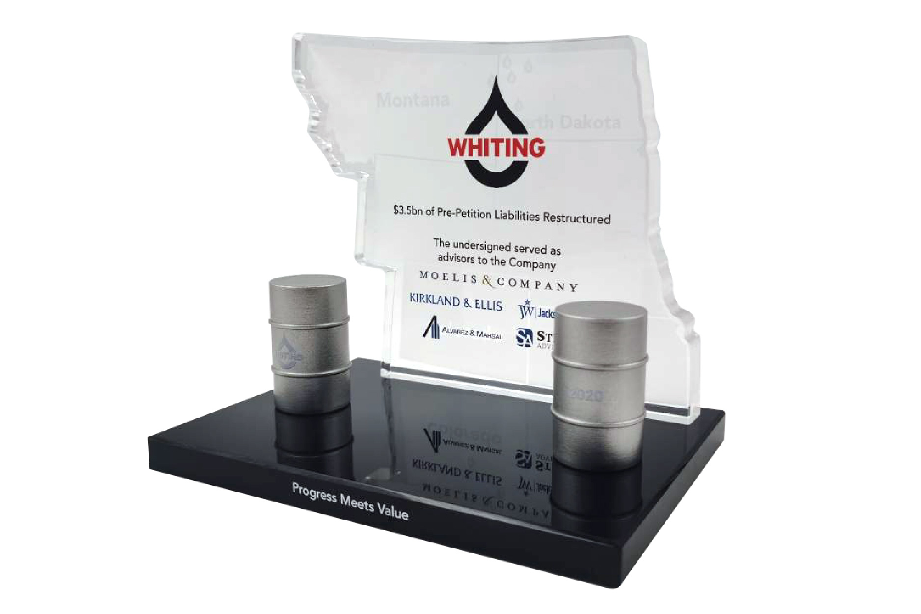 Custom deal toy crafted with a silhouette plaque and model oil barrels presented for a liabilities restructuring.