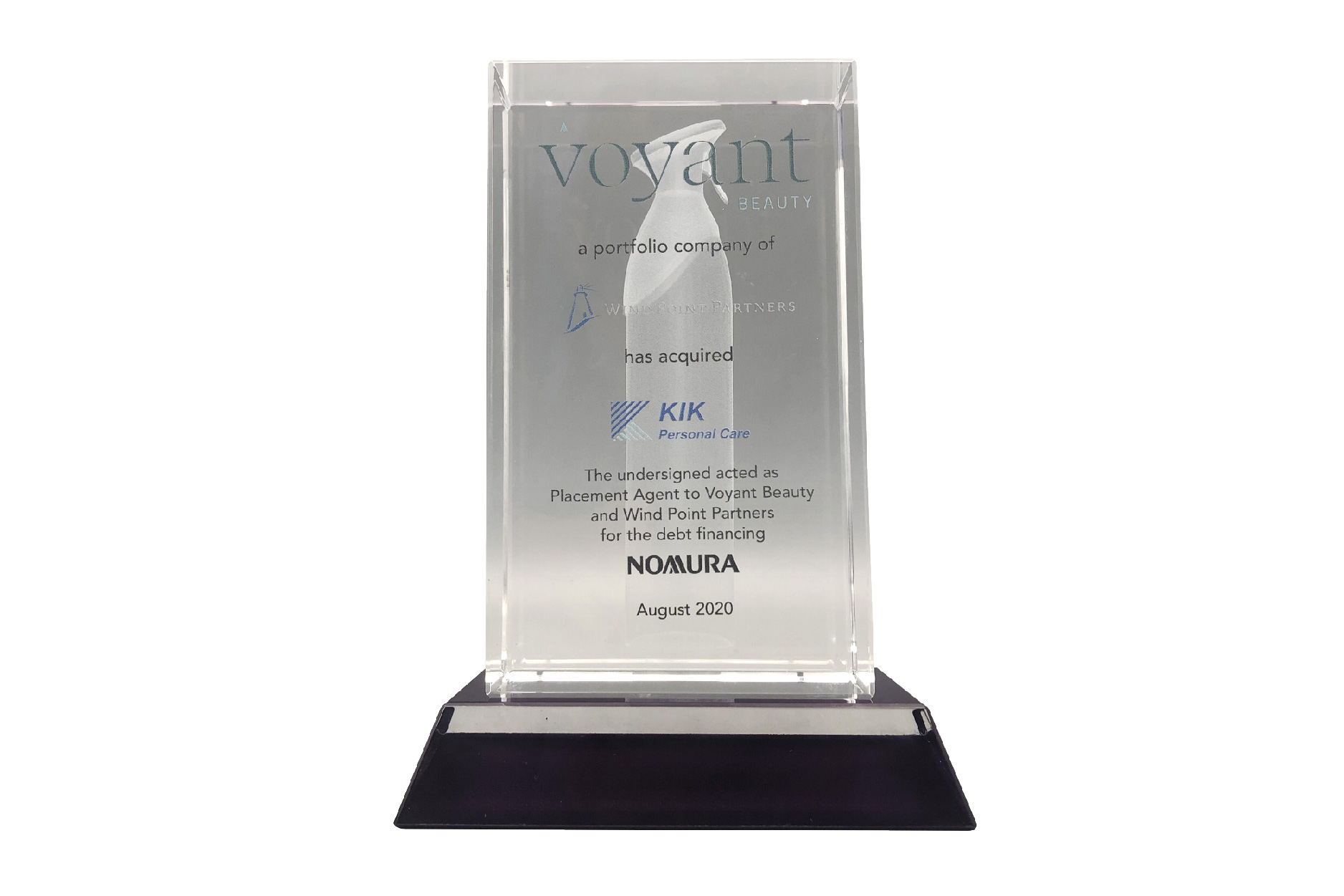 A 3D-etched product model is the centerpiece of this high-end crystal deal gift for the acquisition of a personal care brand.