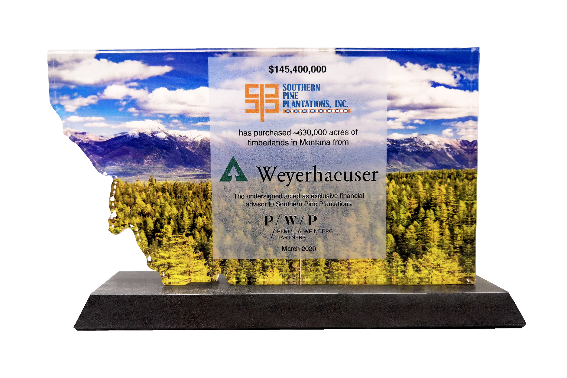 A premium acrylic deal toy crafted by Society Awards Finance Group in recognition of a large land purchase. The transaction details are presented on a reverse color printed, custom-cut plaque.