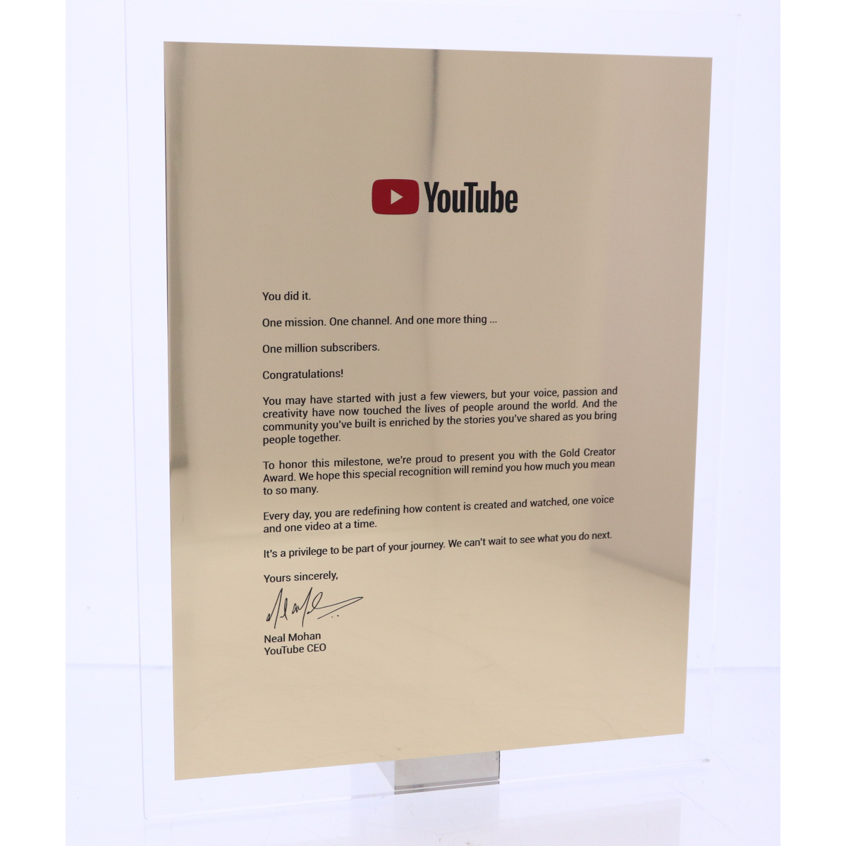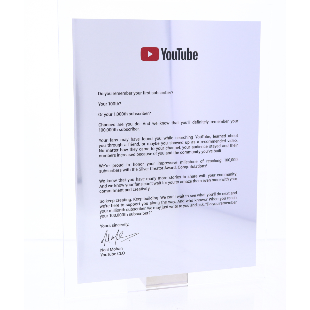 Society Awards is the official manufacturer of YouTube Creator Awards. Eligible Creators can purchase authorized copies of their YouTube Creator Awards on this site.
